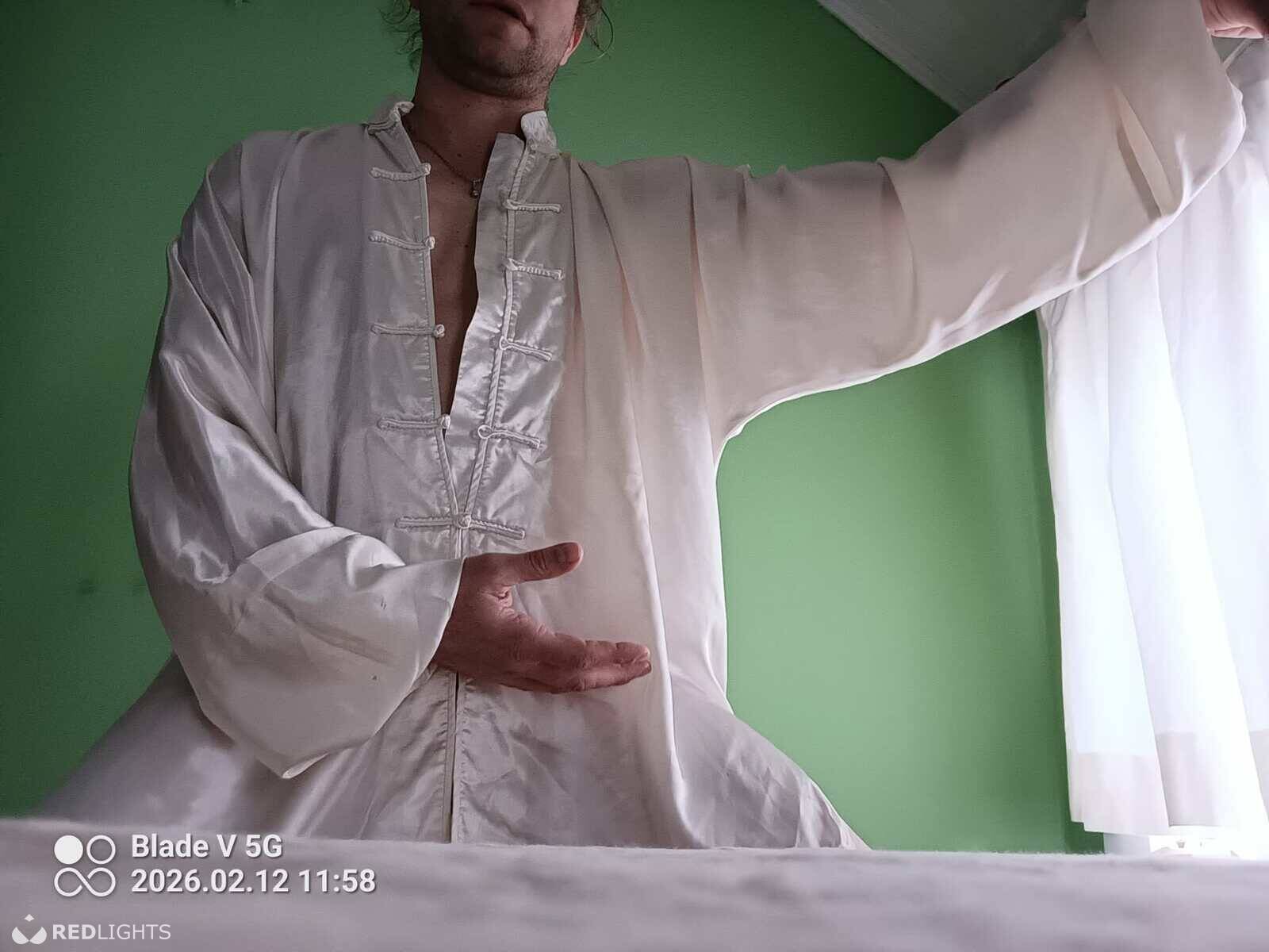 Een sfeertje van rust, sensuele tai chi muziek, en laat je meeglijden in de verleidende trek en duw dansachtige body to body lichaamsbewegingen.