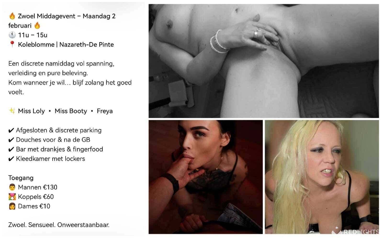 Iedereen welkom op Maandag 02 Februari. Middagevent GB met drie hete meiden, Miss Loly, Miss Booty en Freya die zelf genieten en laten genieten! Intiem is steeds met condoom pijpen zonder condoom. Ruime discrete afgesloten parking op het terrein van de locatie. U kan aansluiten wanneer u wil. Nieuwsgierige koppels en dames zijn ook welkom. Degene die reeds geweest zijn weten dat we er voor gaan! Open vanaf 11u00 tot 15u00. Inkom koppel 60 €, single man/tv/shemale 130 €, single dame 10€. Incl. dranken, finger foods en gebruik van bar, lockers, douche en speelruimtes. Erotisch cafe, Dekoleblomme, Grote Steenweg 29 te 9840 De Pinte