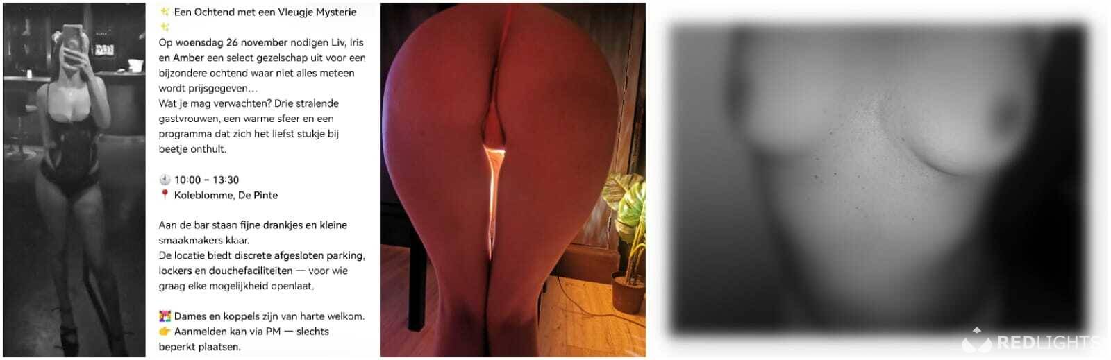 Woensdag 26 november. Ochtend GB met drie hete meiden die zelf genieten en laten genieten! De Hollandse Amber die een dubbelvaginaal niet uit de weg gaat! Liv laat gewillig haar mondje volspuiten! Iris is een geil halfbloedje en de mysterie van de dag! Intiem is steeds met condoom pijpen zonder condoom. Ruime discrete afgesloten parking op het terrein van de locatie. U kan aansluiten wanneer u wil. Nieuwsgierige koppels en dames zijn ook welkom. Degene die reeds geweest zijn weten dat we er voor gaan! De eerste keer hier op deze locatie maar het concept en de meisjes zijn dezelfde! Extra actieve dames of koppels zijn zeer welkom. Open vanaf 10u00 tot 13u30. Inkom koppel 50 €, single man/tv/shemale 130 €, single dame 10€. Incl. dranken, finger foods en gebruik van bar, lockers, douche en speelruimtes. Erotisch cafe, Dekoleblomme, Grote Steenweg 29 te 9840 De Pinte